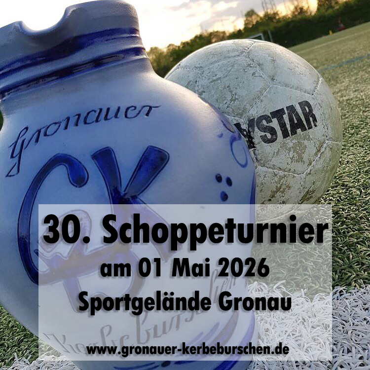 Am 01. Mai 2026 steht wieder das traditionelle Schoppeturnier der Gronauer Kerbeburschen an. Zum 30. Mal jährt sich das Ereignis. Für unsere Spieler aber auch für alle anderen Gäste bieten die Kerbeburschen kühle Getränke, Wurst und Fleisch vom Holzkohlegrill sowie Pommes Frites und eine große Kuchentheke. Das 30. Schoppeturnier startet um 10:00 Uhr.